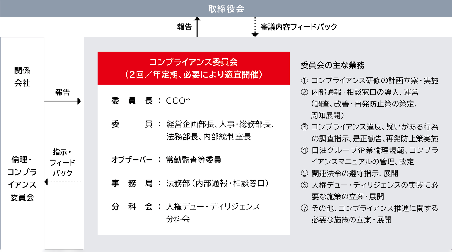 日油グループでは、すべての連結子会社に倫理・コンプライアンス責任者と審議組織を設置しています。日油のコンプライアンス委員会は、年2回の定期開催に加え、問題発生時には随時開催し、問題の把握、対応策の立案・フォローを実施。その結果は取締役会に報告し、必要に応じて審議しています。