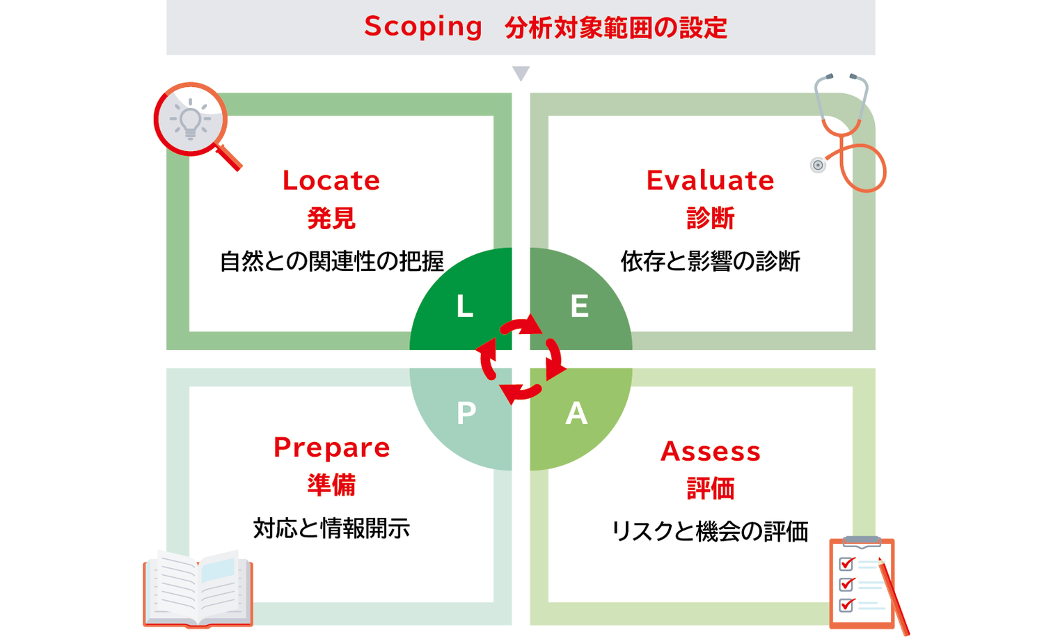 LEAPアプローチとは、自然関連のリスクと機会を科学的根拠に基づき体系的に評価するためのプロセスです。「LEAP」は自然に関して影響度が大きい地域、つまり優先地域を特定するLocate、自然への依存と影響の特定・診断をするEvaluate、自然に関するリスク・機会の特定・評価をするAssess、情報開示の準備をするPrepareの頭文字をとったもので、それに加え、最初に、分析対象範囲を設定するScopingの入った手法です。