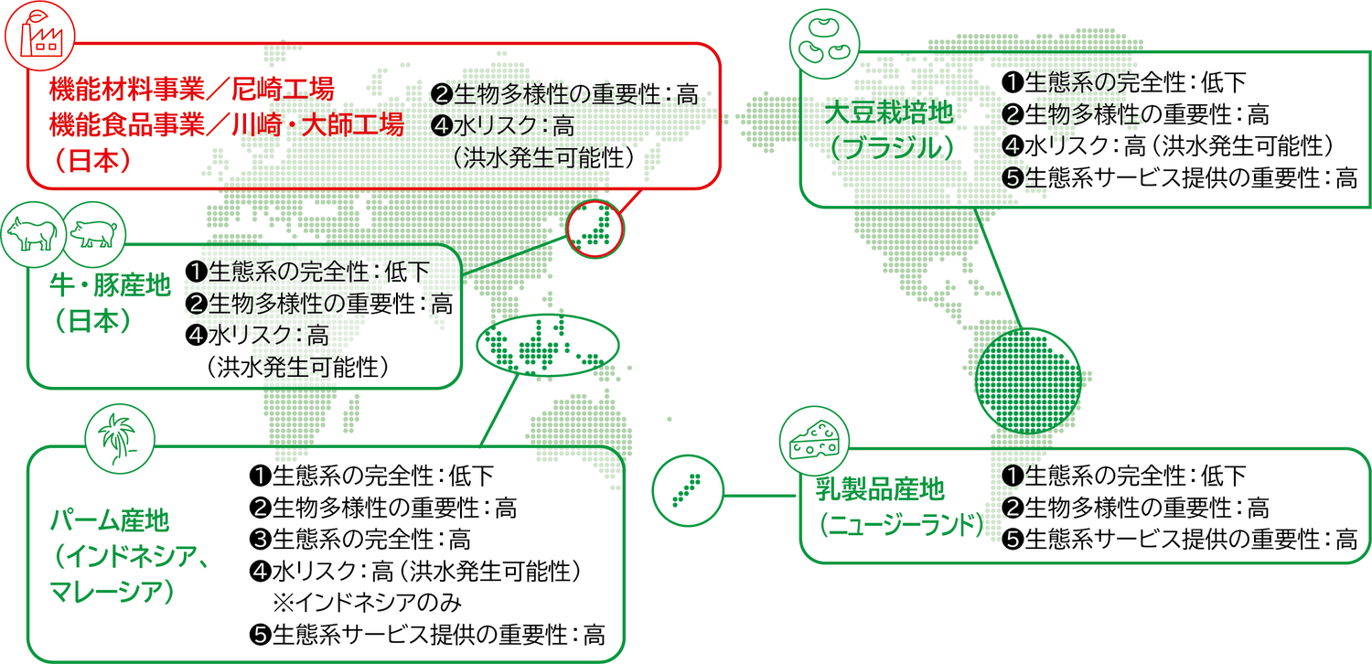 自然関連課題がある地域として、「(2)開示の範囲」に該当する日油グループの全生産拠点および原材料の生産地や調達先拠点を選定し、分析しました。分析結果の詳細については、「戦略」をご参照ください。 - 他のサステナビリティ関連の開示との統合