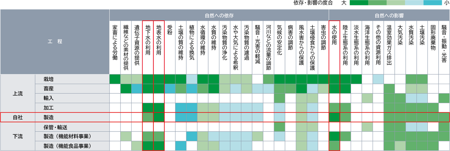 一方、自然に与える影響に関して、バリューチェーン全体で前記の依存と同様に「水」の使用の影響度が高く、自社事業の製造においても「水」の使用が特に高い要素と認識し、継続して水の使用量削減、水質の維持に努めていきます。