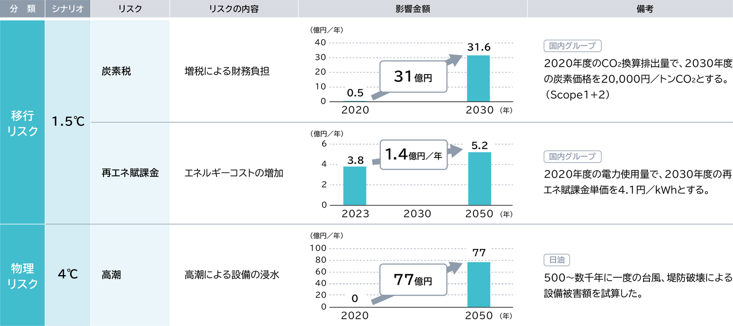 本開示におけるリスク・機会の評価では、日油グループのリスクマネジメントやTCFD開示との整合の観点からシングルマテリアリティアプローチを採用しました。 - 開示の範囲