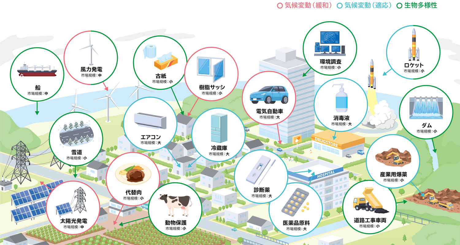 気候変動の進行に伴い、海水温をはじめ、地球全域を調査する必要性が高まる可能性があり、調査のための海洋機器やロケット打ち上げ回数などが増加する可能性があります。また、特定温度に達すると色が変わる温度管理用示温材(ラベルやシールなど)の用途が拡大する可能性があります。さらに、高潮などのリスク増加に伴い、産業用爆薬を用いて、山間部から岩石・土砂を調達する堤防工事が増加する可能性があります。