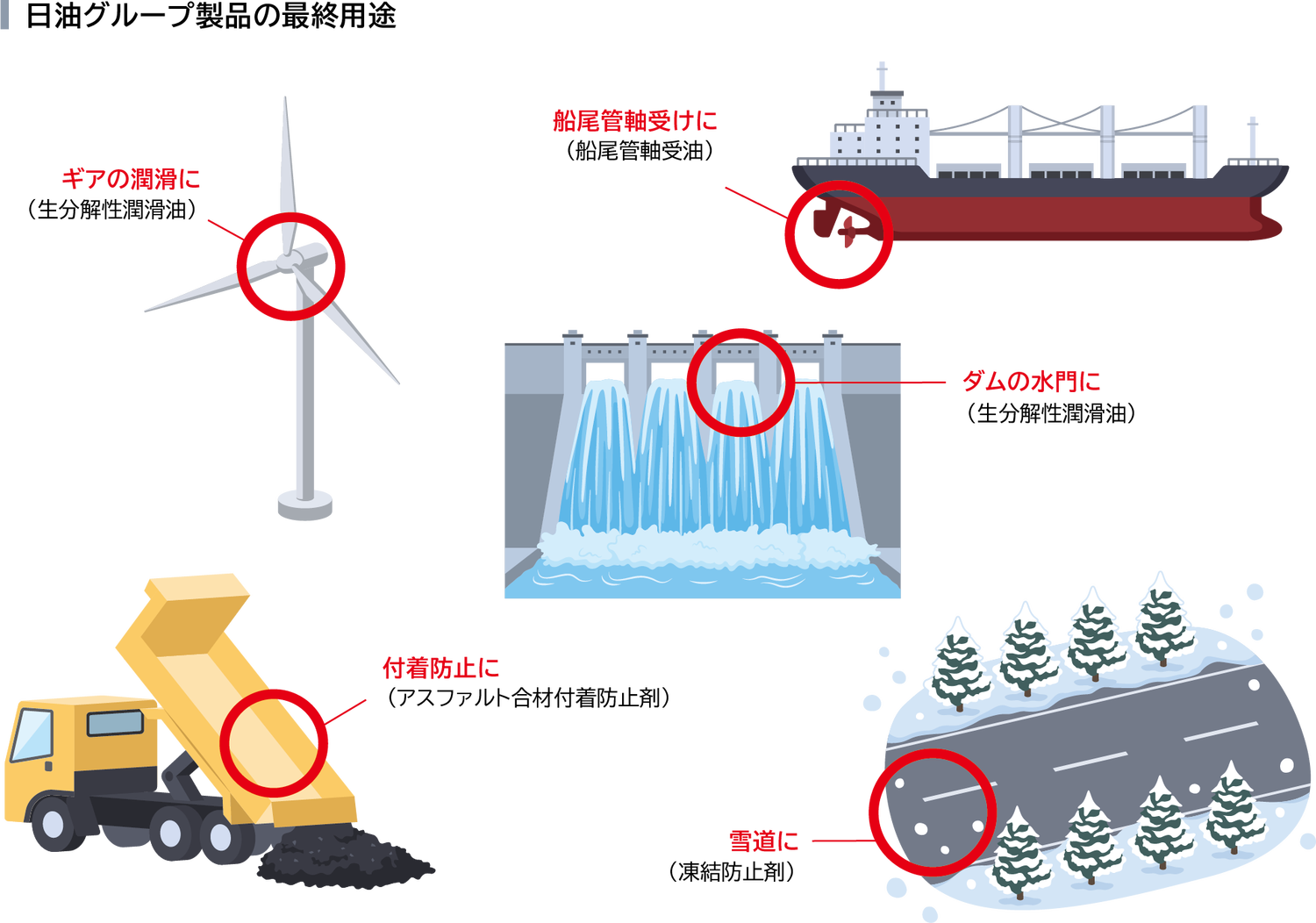 建設機器やダムの水門、風力発電などに使用される従来の潤滑油や船尾管軸受油、道路工事に使用されるアスファルト合材付着防止剤は自然界に露出すると環境を汚染するため、日油グループでは生分解性に優れる製品を提供し、土壌・水質汚染防止に貢献しています。