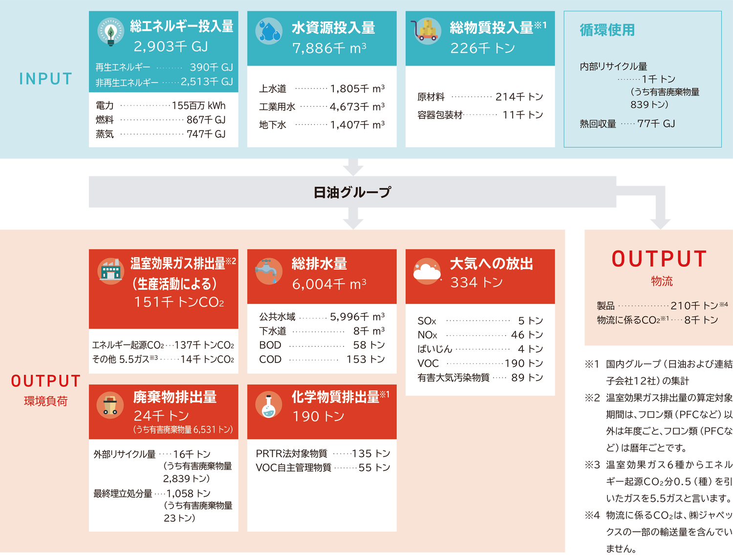 日油グループにおける2024年度の事業活動に伴う環境負荷の状況は以下のとおりです。