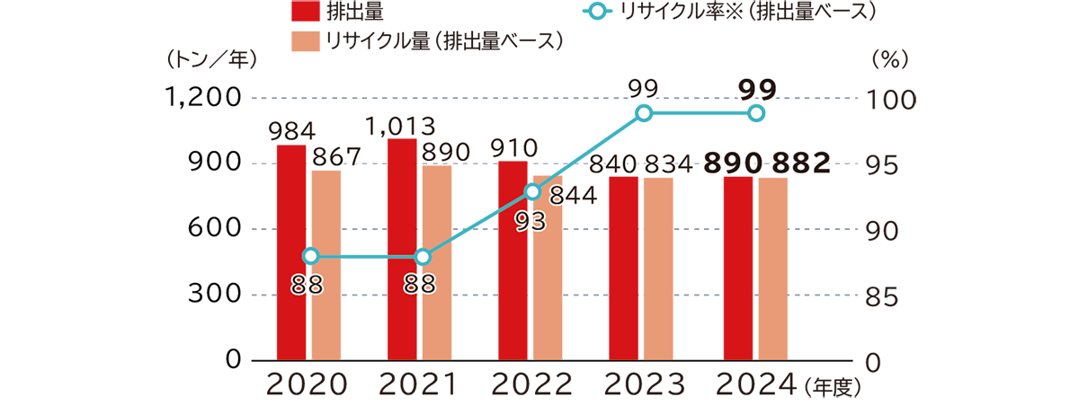 2024年度は、日油グループで、廃プラスチック排出量が50トン増加の890トンとなり、排出量に対するリサイクル率は99%となりました。また、国内グループの廃棄物の再資源化による販売額は、249百万円となりました。