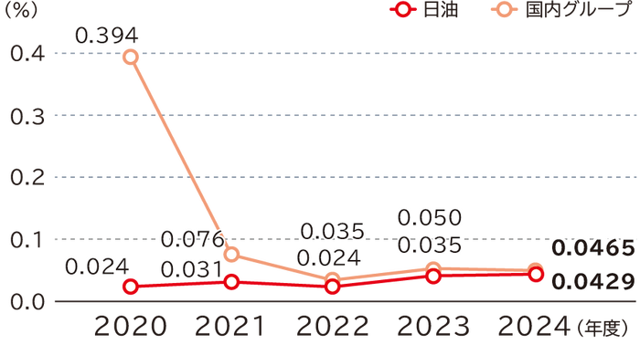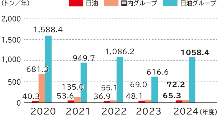 2024年度の国内グループの最終埋立処分量は72.2トンで、ゼロエミッション率は0.047%でした。一方、日油の最終埋立処分量は65.3トンで、ゼロエミッション率は0.043%でした。