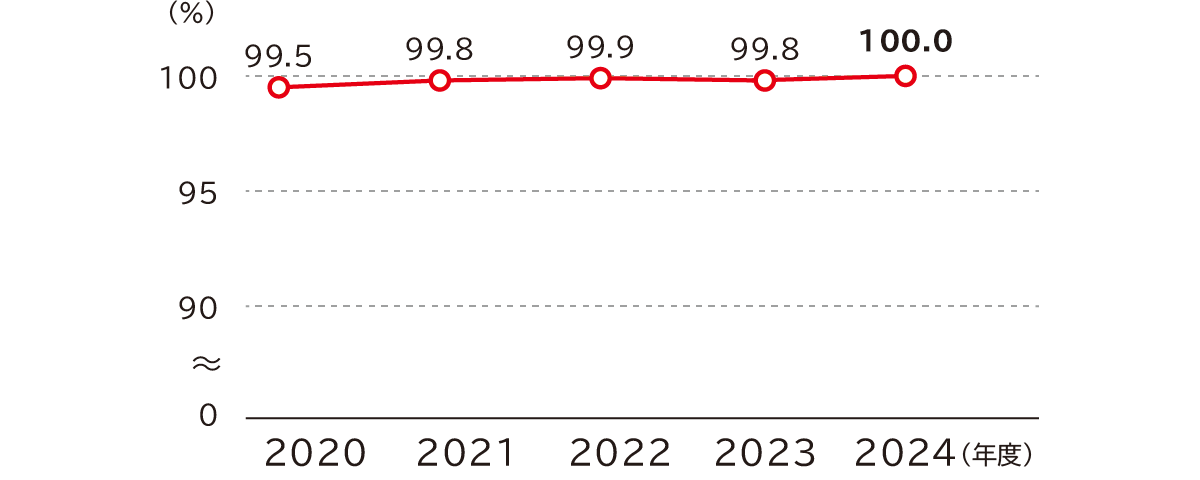 定期健康診断は、法定の項目に加えて腫瘍マーカーなど任意のオプション検査を行っています。定期健康診断の実施後は、日油健康保険組合と協働し、効率的かつ効果的な特定健康診査および特定保健指導の実施に取り組んでいます。日油の定期健康診断受診率は、2024年度100%となりました。