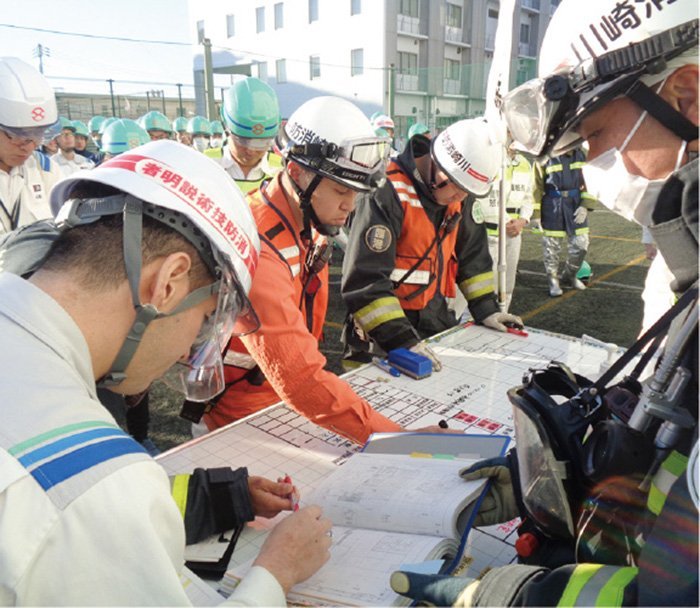 日油グループでは、有機過酸化物をはじめとする危険物、火薬類を製造し、災害発生時に社内外への被害を最小限にとどめることを最重要事項と考え、積極的に防災訓練に取り組んでいます。特に地域組織との合同防災訓練を定期的に実施することで、地域と一丸になった災害対策の強化を図っています。また、地元自衛消防隊消火操法大会などにも積極的に参加することで、消火技術の向上を図り、地域へ安全意識の高さをアピールしています。