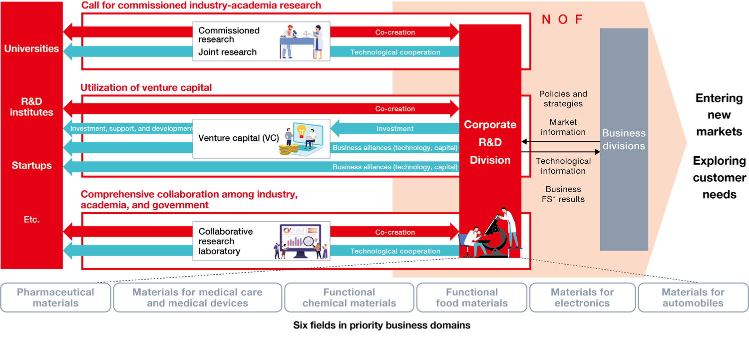 To strengthen the six priority fields, NOF continues to be involved in open innovation. By collaborating with external institutions, we can expect to discover new technologies and businesses unbound by existing business domains.
