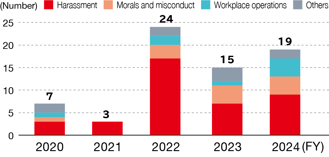The Legal Department conducts employee engagement surveys to visualize the status of the organization. The surveys include an open-ended section that we use to solicit a wide range of feedback from employees, such as whether they have experienced any gender discrimination or whether internal systems are easy to use. Responses are then checked within the Legal Department, and measures in line with employee requests are considered and implemented as necessary. In particular, we will take measures to deal on a case-by-case basis with whistleblowing incidents that directly reflect employees’ concerns, while bearing in mind that the issues that have surfaced are just the tip of the iceberg.