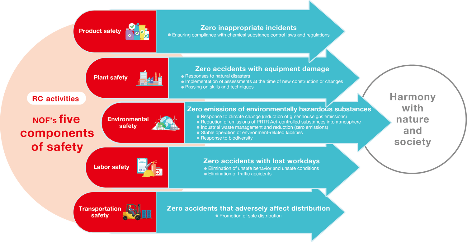 The Group, which handles chemical products, ensures the protection of the environment, health, and safety in all processes from development, manufacturing, distribution, use, and final consumption to the disposal of chemical products, and is developing Responsible Care (RC) activities to make the results thereof publicly available and engage in dialogue and communication with society. In addition, we have defined the topics of RC activities as the “five components of safety,” which comprise “environmental safety,” “plant safety,” “product safety,” “occupational safety,” and “distribution safety,” and we have been working to steadily improve the level of these activities by implementing the PDCA cycle since 1995. Further, in order to achieve harmony with the natural and social environment, we have set a final target for the five components of safety of achieving “zero” for each item.