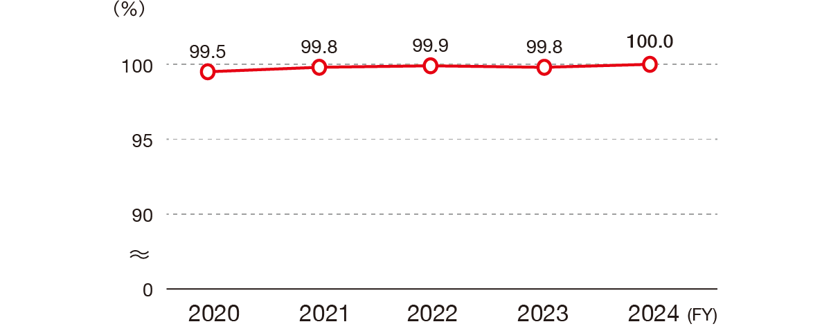 NOF is promoting comprehensive measures including the prevention and alleviation of mental health issues and return-to-work support. We have conducted stress tests annually since 2009, with the results being deliberated upon by the safety and health committees at each works, and examine and implement necessary measures. In fiscal 2024, the uptake rate of stress tests was 100%.
