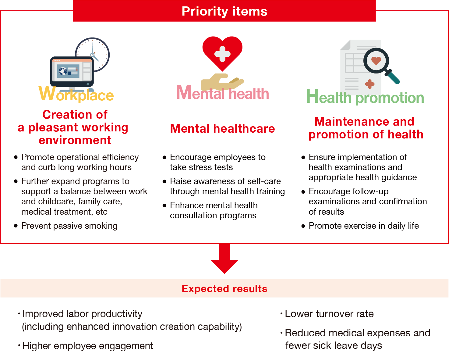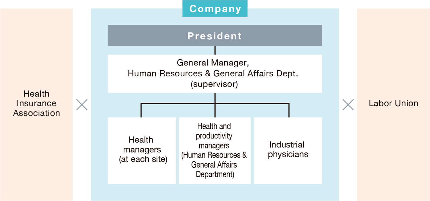 With the General Manager of the Human Resources & General Affairs Dept. serving as the overall supervisor, the Department’s health management promotion personnel lead efforts on priority areas. In addition, for this promotion, we also collaborate with on-site health managers, occupational physicians, the Health Insurance Association, the Labor Union, etc.